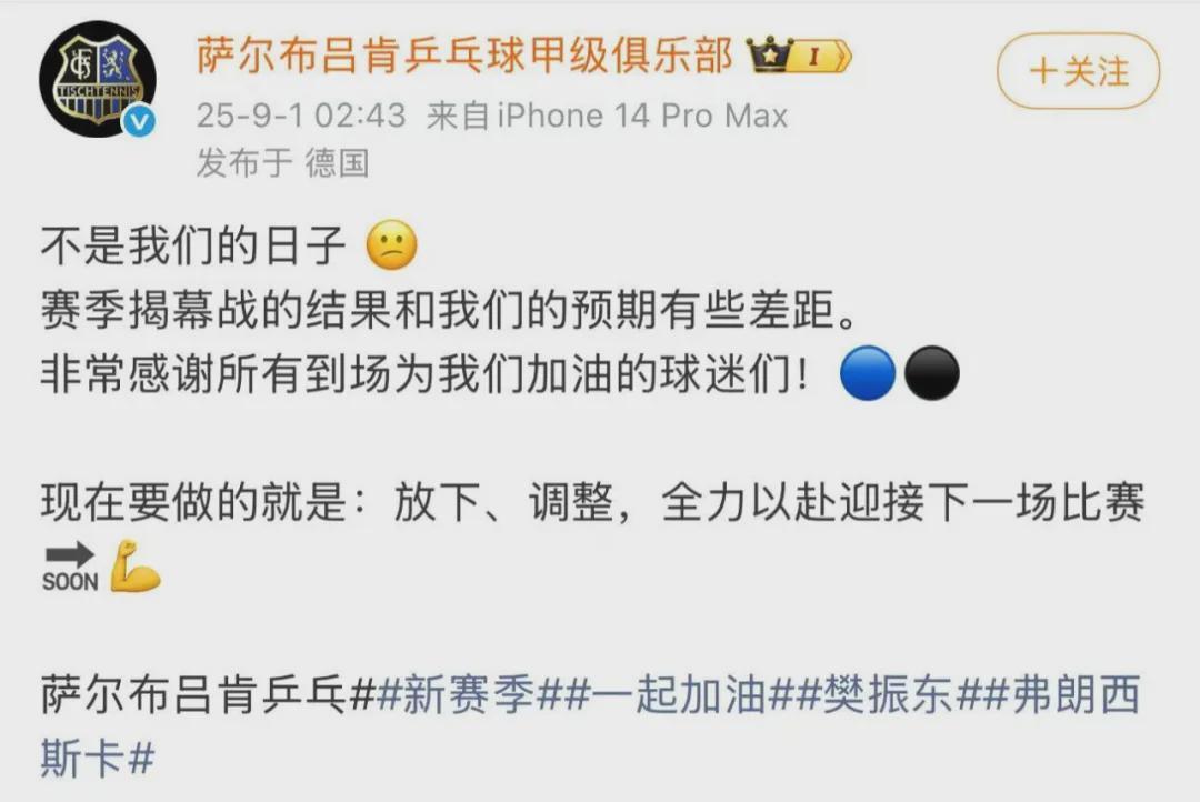 9月1日,萨尔布吕肯乒乓球甲级俱乐部发文回应首战失利:赛季揭幕战的结果和我们的预期有些差距,非常感谢所有到场为我们加油的球迷们!现在要做的就是放下、调整,全力以赴迎接下一场比赛!