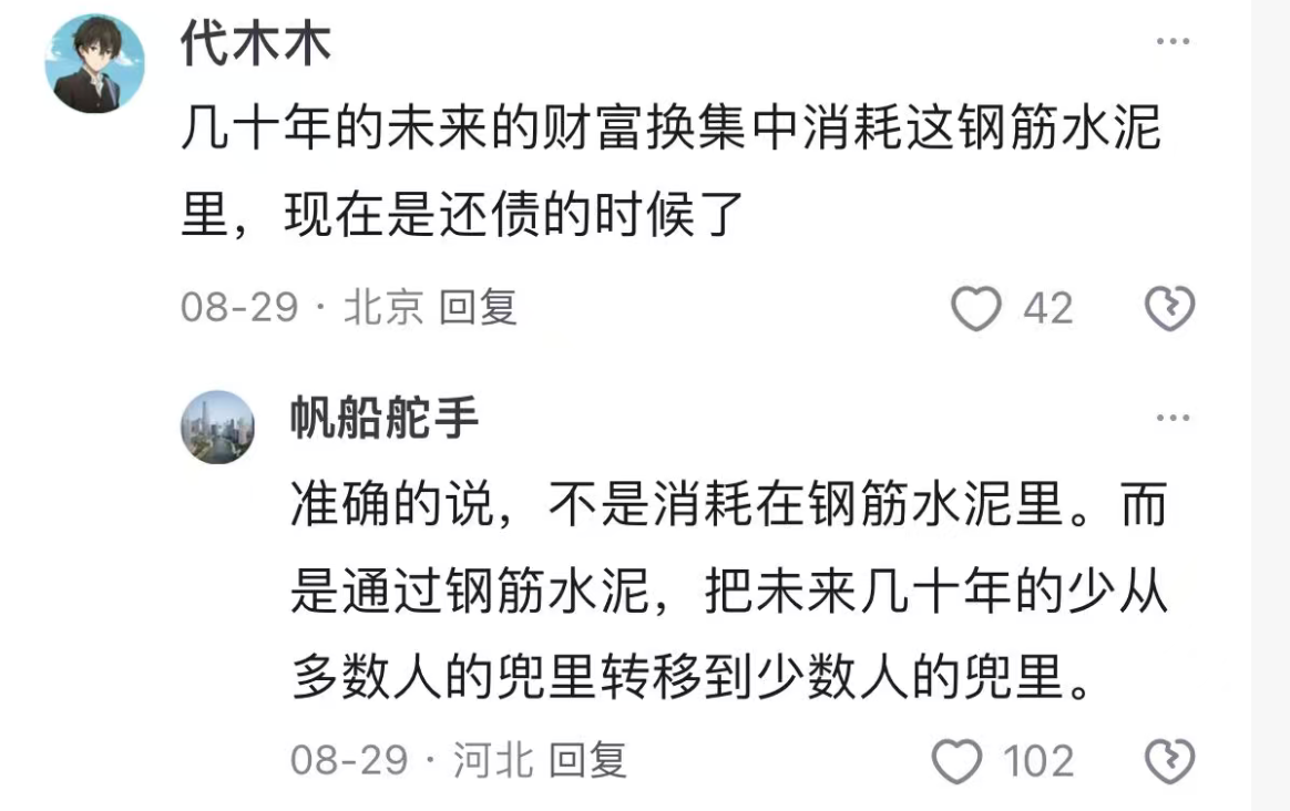 关于这一点,一位叫明明明之的网友说得很清楚,我们的地产行业前些年的发展,算是一种典型的卷走几代人财富的行为。