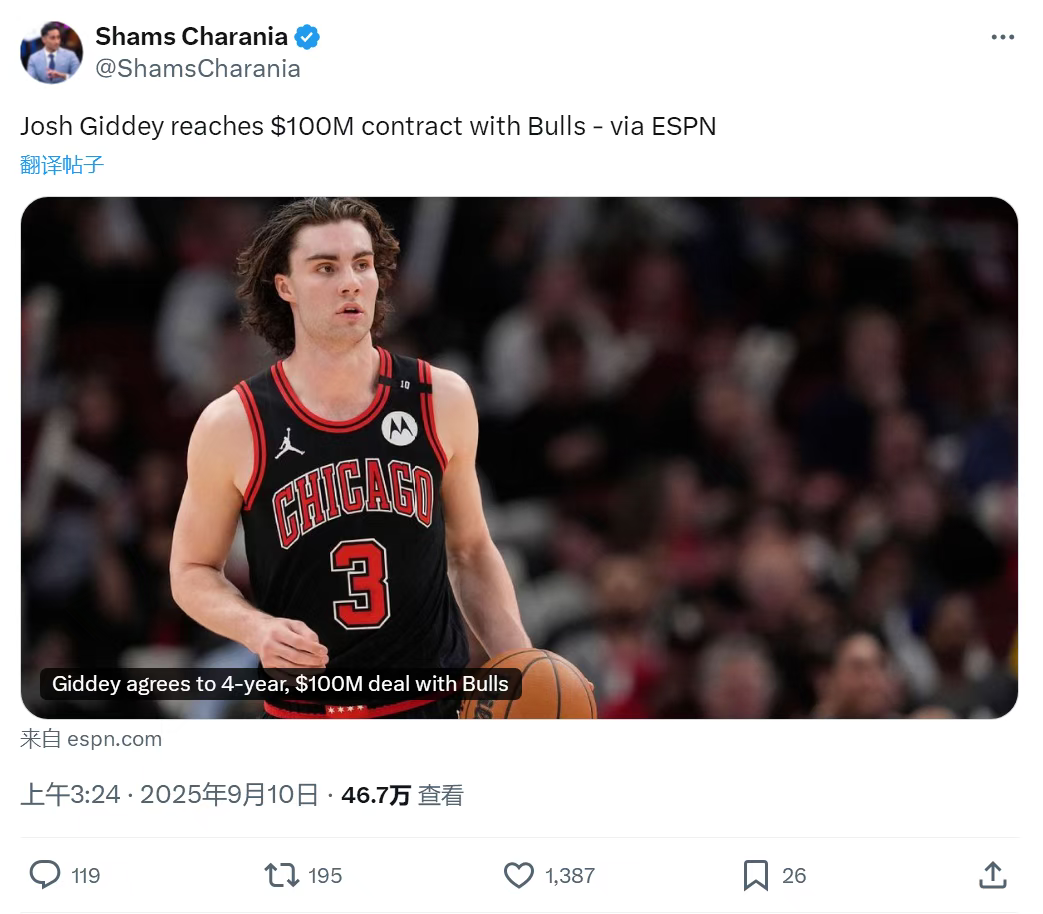 在 NBA 的休赛期,球员续约动态一直是球迷关注的焦点。近日,据名记 Shams 爆料,约什 - 吉迪与公牛队成功签下一份 4 年 1 亿美元的续约合同,这一消息瞬间在篮球圈内引发热议。