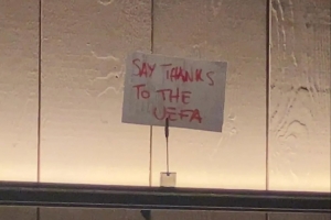 在原本放置烈酒的架子处,贴着一张纸条,解释了为什么只能卖啤酒。纸条用鲜红色的字写着:“感谢欧足联”,下面还贴着另一张写着“这不是我们的错”。